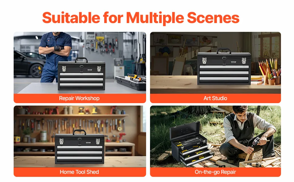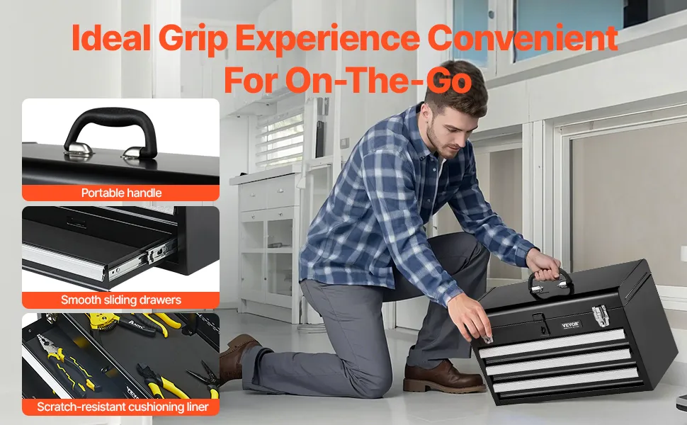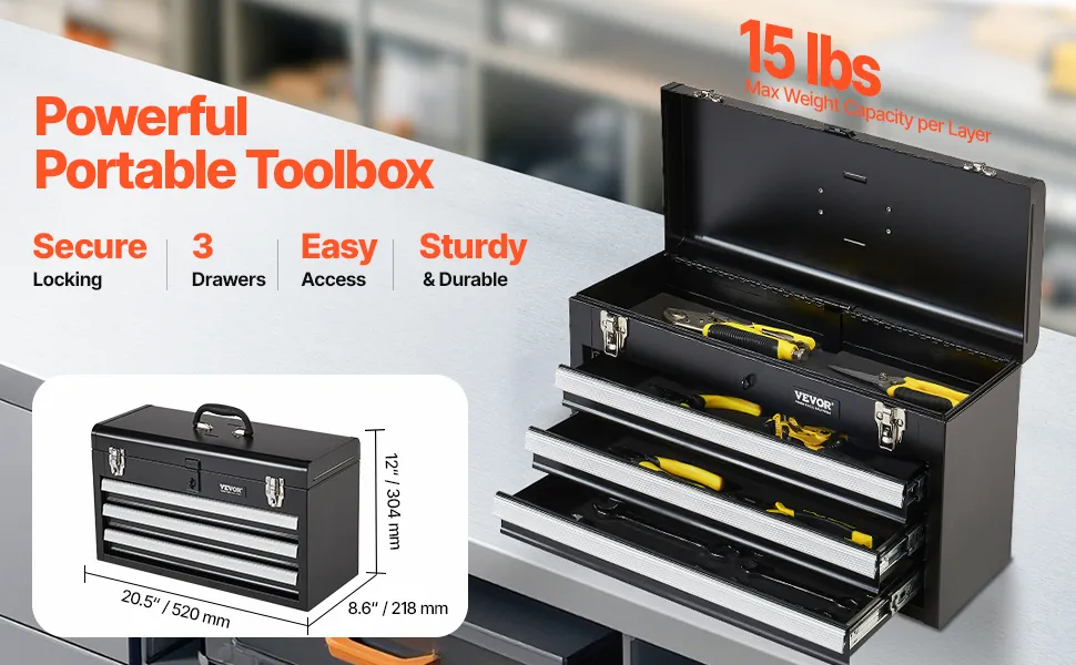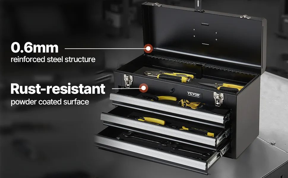 VEVOR Cassetta degli Attrezzi in Metallo, 520 mm con 3 Cassetti Cassetta degli Attrezzi Portatile in Metallo, Cassetta degli Attrezzi con Rivestimenti Piedini, Acciaio con Cuscinetti a Sfera, Nero