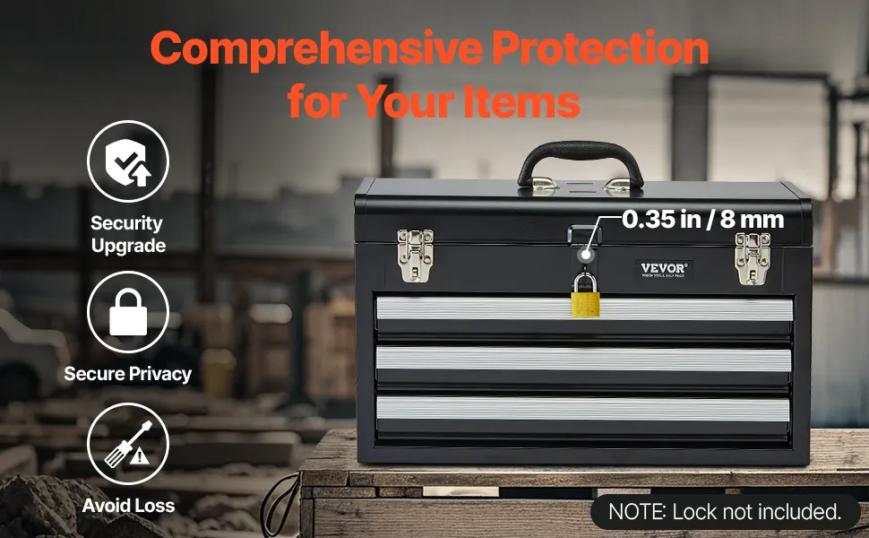 La cassetta degli attrezzi in acciaio è dotata di molteplici meccanismi di bloccaggio per garantire che i tuoi oggetti rimangano al sicuro durante il trasporto. Dotata di un lucchetto, aumenta la sicurezza ed evita i furti.