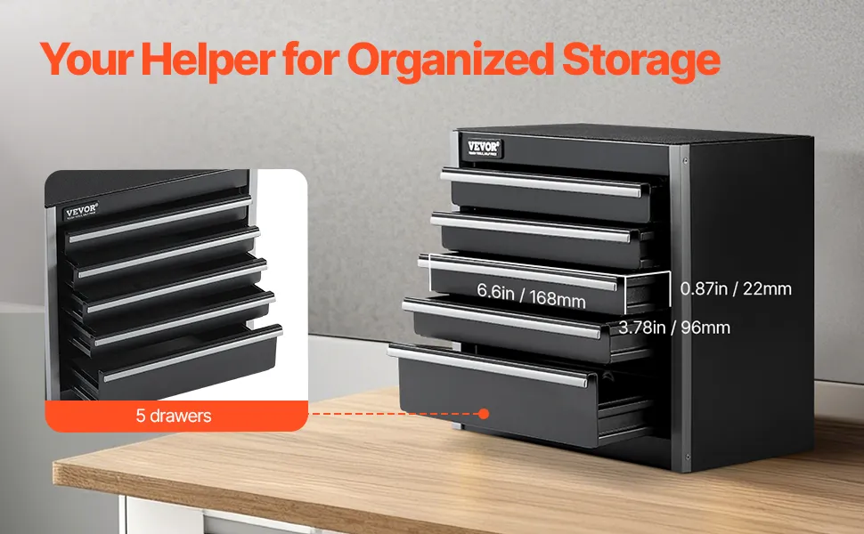 VEVOR Cassetta degli Attrezzi in Metallo, 218 mm con 5 Cassetti Cassetta degli Attrezzi Portatile in Metallo, Cassetta degli Attrezzi con Rivestimenti Piedini, Acciaio con Cuscinetti a Sfera, Nero