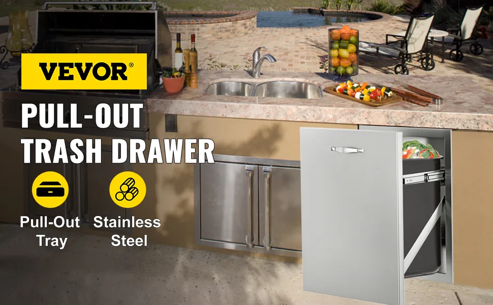 Il cassetto scorre senza sforzo, assicurando una gestione dei rifiuti semplice ed efficiente. Aggiungere questo cassetto estraibile per la spazzatura alla tua configurazione può semplificare le operazioni in cucina e aggiungere un tocco di professionalità. La funzione estraibile semplifica l'accesso e la gestione dei rifiuti, mantenendo il tuo spazio esterno pulito e ordinato. Questo componente aggiuntivo essenziale porta la praticità della cucina a un livello superiore con il minimo sforzo.