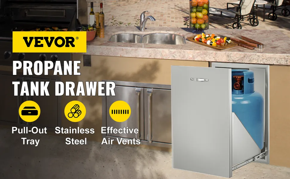 Questo cassetto per bombola di propano da cucina per esterni è perfetto per qualsiasi ambiente. Può essere utilizzato sia in cucine esterne che interne. Quindi, non importa se stai allestendo un'isola per barbecue o una cucina esterna; puoi adattare perfettamente questo elettrodomestico. Grazie al suo design resistente alle intemperie, il cassetto per bombola di propano da cucina per esterni VEVOR può contenere vari utensili da cucina come piatti, forchette e cucchiai. Pertanto, anche in condizioni di vento o pioggia, il cassetto funziona bene in tutti i tipi di condizioni atmosferiche. Ciò lo rende ideale per ogni cucina o sala da pranzo all'aperto.