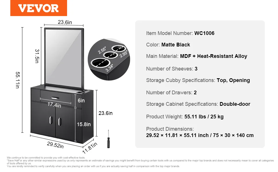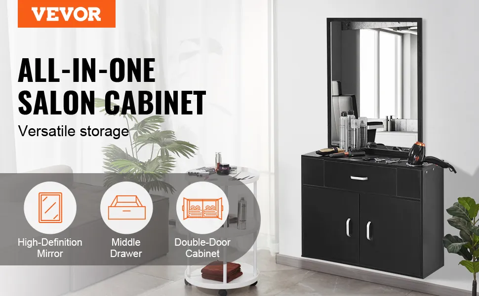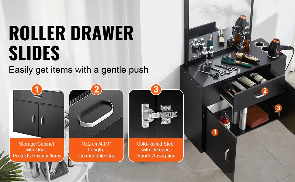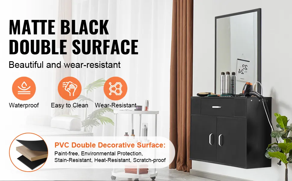 Materiale durevole: costruita con un pannello MDF ispessito e una doppia superficie decorativa in PVC nero opaco, la nostra postazione per parrucchieri è impermeabile e facile da pulire. Il suo design versatile si abbina a vari stili di arredamento d'interni, migliorandone l'estetica.