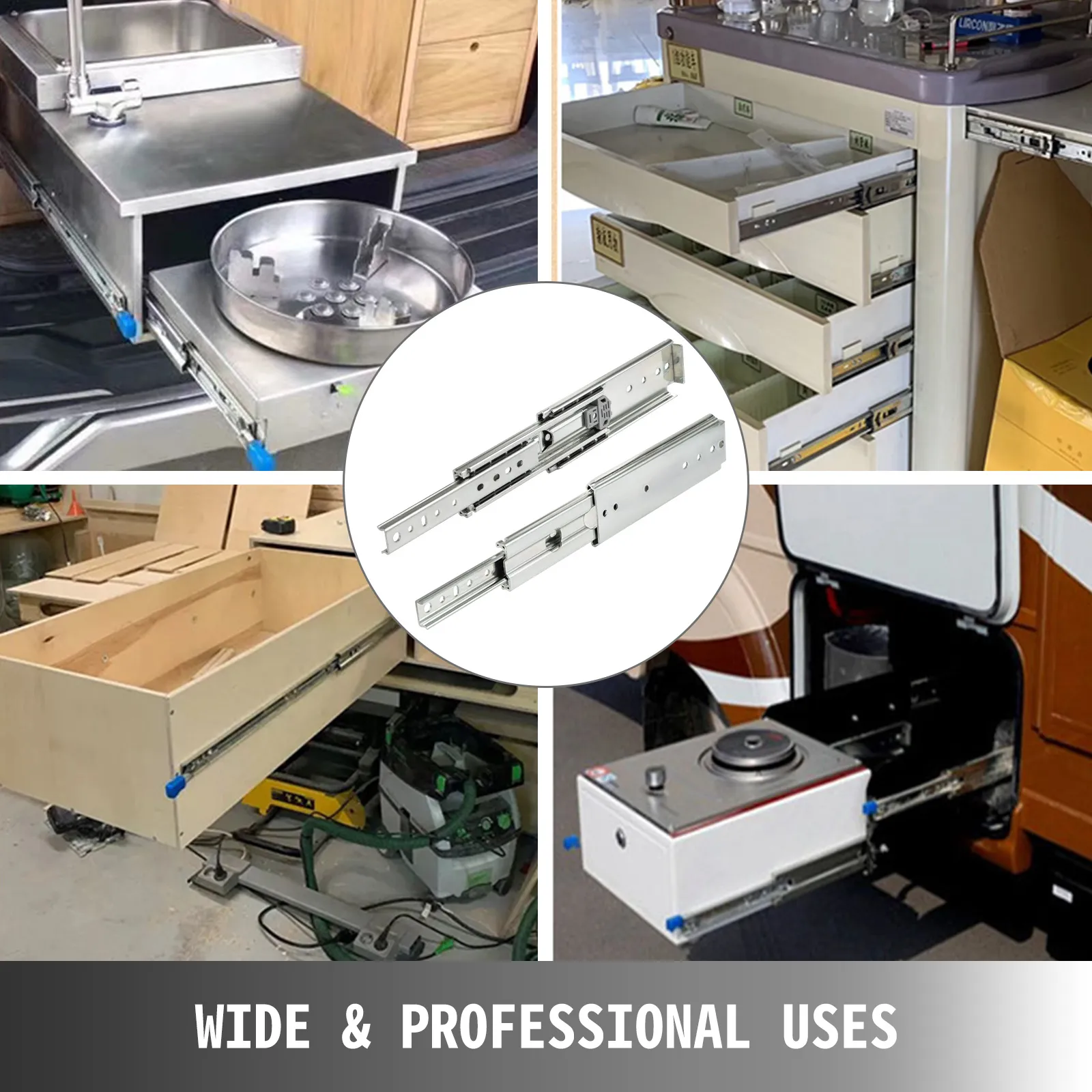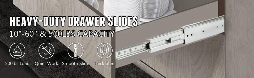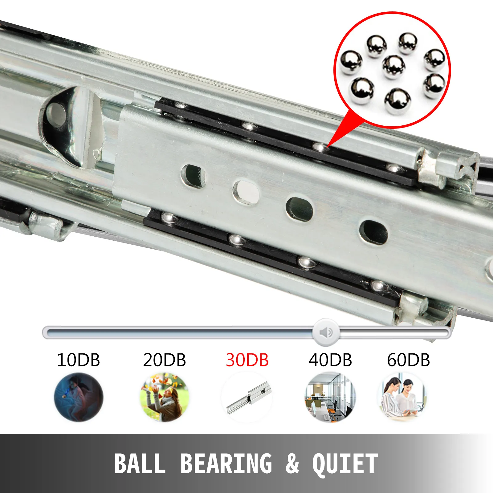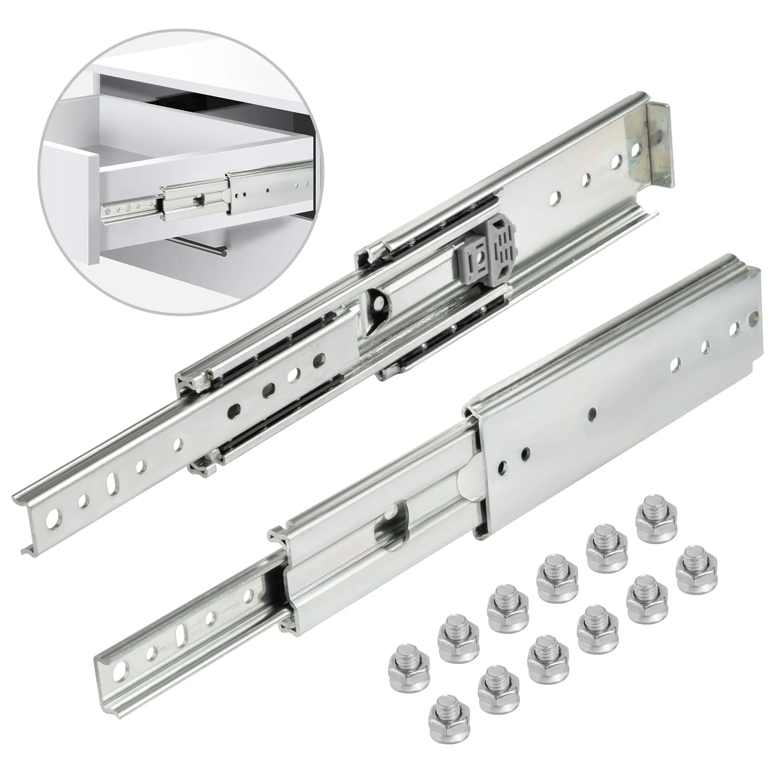 Questa è una coppia di kit di guide per cassetti di alta qualità per uso industriale e domestico. È dotato di un pesante materiale portante in acciaio laminato a freddo da 500 libbre. I cuscinetti a sfera all'interno lo rendono scorrevole e silenzioso. È un ottimo prodotto che combina praticità e bellezza.