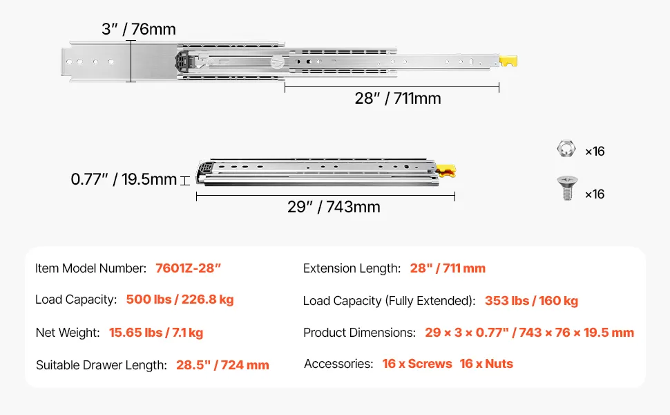 500 libbre Heavy-Duty: realizzate in acciaio ad alta durezza spesso 0,77 pollici/19,5 mm, le guide per cassetti per impieghi gravosi hanno una capacità di peso fino a 500 libbre. La finitura zincata rende le guide telescopiche per cassetti resistenti alla ruggine e all'usura per un uso prolungato. Possono essere utilizzate in scaffalature, armadi, cassetti industriali, camper, camion, distributori automatici e altro ancora
