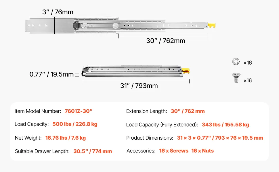 Guide per cassetti a 3 pieghe: puoi ottenere 1 coppia di guide per cassetti: 31 pollici/793 mm di lunghezza, 3 pollici/76 mm di larghezza, 0,77 pollici/19,5 mm di spessore. Con il design a estensione completa a 3 pieghe, puoi raggiungere l'intero cassetto. È un buon assistente per utilizzare lo spazio del cassetto