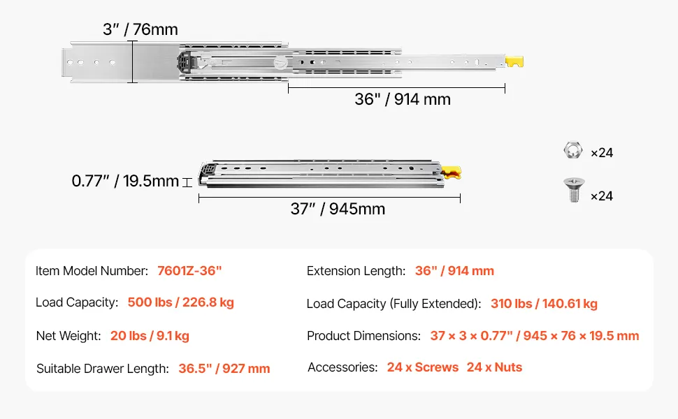 Con una capacità di carico di 500 libbre / 226,8 kg, queste guide per cassetti sono realizzate in acciaio di alta qualità, sono resistenti alla ruggine e alla corrosione e sono costruite per durare, soddisfacendo tutte le vostre esigenze di carico.