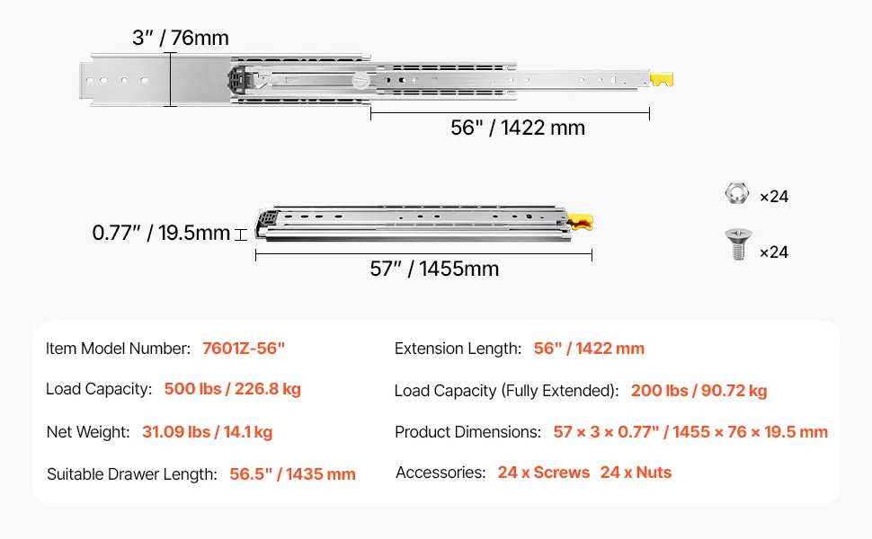 Guide per cassetti a 3 pieghe: puoi ottenere 1 coppia di guide per cassetti: 57 pollici/1455 mm di lunghezza, 3 pollici/76 mm di larghezza, 0,77 pollici/19,5 mm di spessore. Con il design a estensione completa a 3 pieghe, puoi raggiungere l'intero cassetto