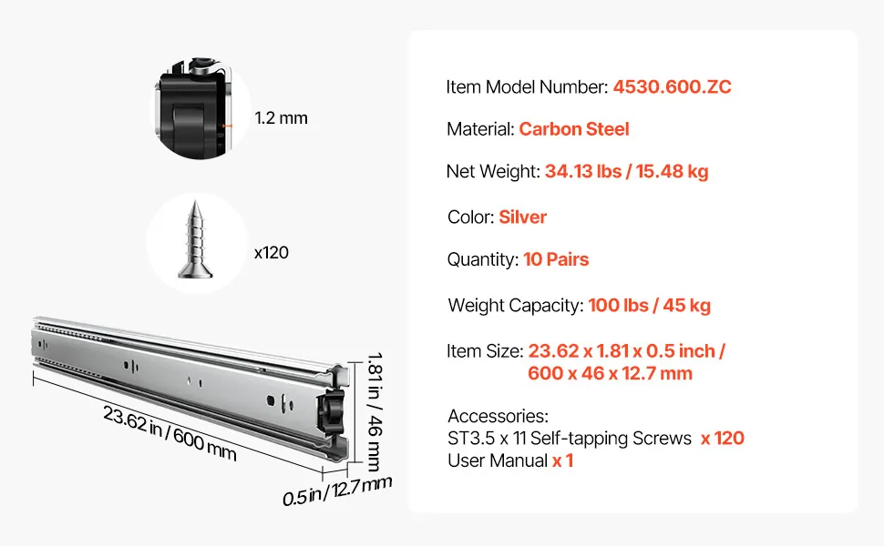 Questo set include 10 paia di guide per cassetti, rendendolo facile da installare nei cassetti del tuo mobile. L'acciaio zincato spesso garantisce una lunga durata e la funzione di estensione completa a tre sezioni consente un facile accesso agli oggetti riposti.