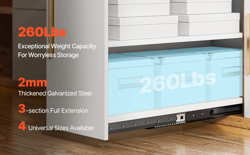 4 misure universali: disponibili nelle misure 16", 24", 32" e 40", compatibili con una varietà di guide per cassetti tradizionali, consentendo una sostituzione e un utilizzo flessibili. Queste misure soddisfano le diverse esigenze dei mobili, garantendo una perfetta vestibilità per un'ampia gamma di applicazioni domestiche e d'ufficio