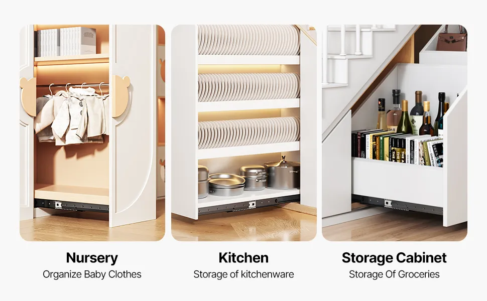 Grazie alla funzione di chiusura silenziosa, queste guide per cassetti assicurano che il tuo bambino non venga disturbato mentre dorme. Sono adatte a vari ambienti, tra cui i mobili laterali della cucina, i cassetti dei camper e i mobili delle scale.