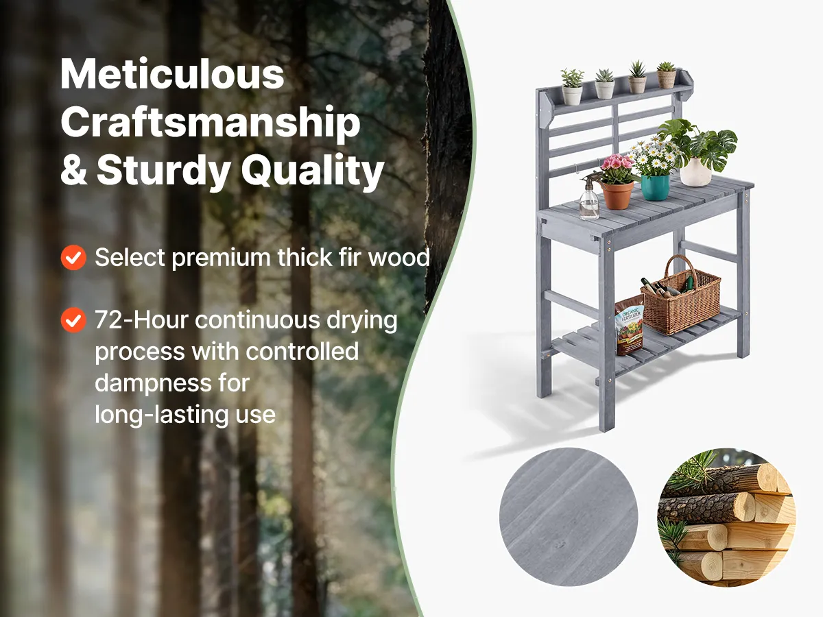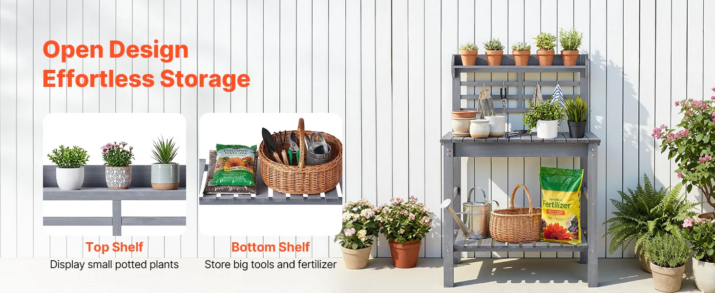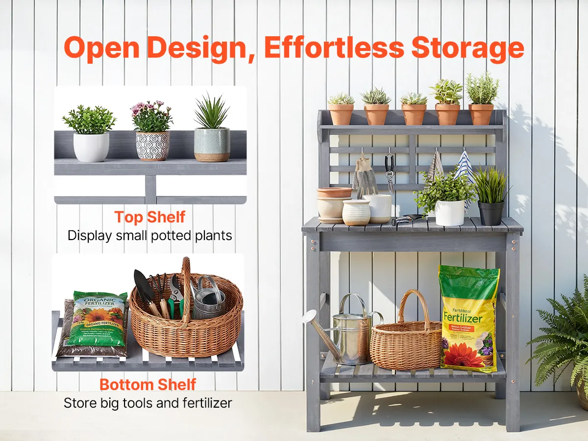 Ampio spazio di archiviazione: il nostro tavolo da invasatura è dotato di un ripiano superiore per esporre piccole piante in vaso, mentre il mobiletto e il ripiano inferiore possono contenere attrezzi più grandi, fertilizzanti e altro ancora