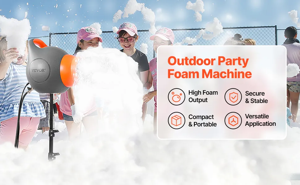 Questa macchina per la schiuma è dotata di una ventola centrifuga impermeabile per una produzione continua di schiuma. Funziona silenziosamente, è facile da installare e può essere utilizzata con un treppiede o appesa. Ideale per compleanni, feste in piscina e matrimoni.