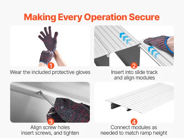 Sicuro e stabile: la rampa d'ingresso è saldamente bloccata con connettori a vite, garantendo che le unità rimangano collegate senza scivolare. Includiamo anche guanti protettivi per un montaggio facile e sicuro