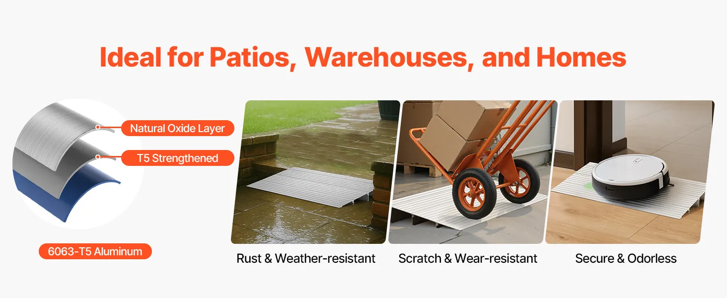 Elevata capacità di carico: questa rampa da soglia, realizzata in alluminio aeronautico 6063-T5 con un nucleo solido da 2 mm, può supportare fino a 360 kg. Rimane stabile anche sotto sedie a rotelle, carrelli o attrezzature pesanti
