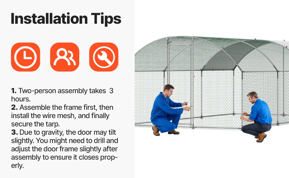• Struttura robusta: con tubi in acciaio zincato spessi 1" e saldature precise, questo grande pollaio in metallo vanta stabilità e resistenza al vento. La copertura superiore facilita un drenaggio efficace, impedendo l'accumulo di acqua