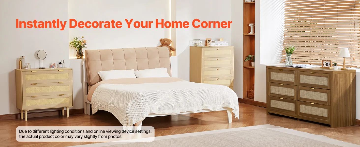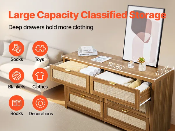 La nostra spaziosa cassettiera in rattan offre spazio multistrato. Grazie ai suoi cassetti profondi e ampi, offre ampio spazio per vestiti e oggetti di uso quotidiano. Il ripiano superiore offre spazio per decorazioni od oggetti di uso frequente, soddisfacendo così diverse esigenze organizzative.