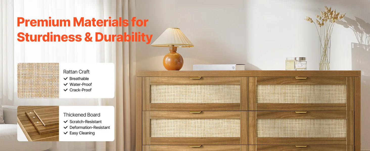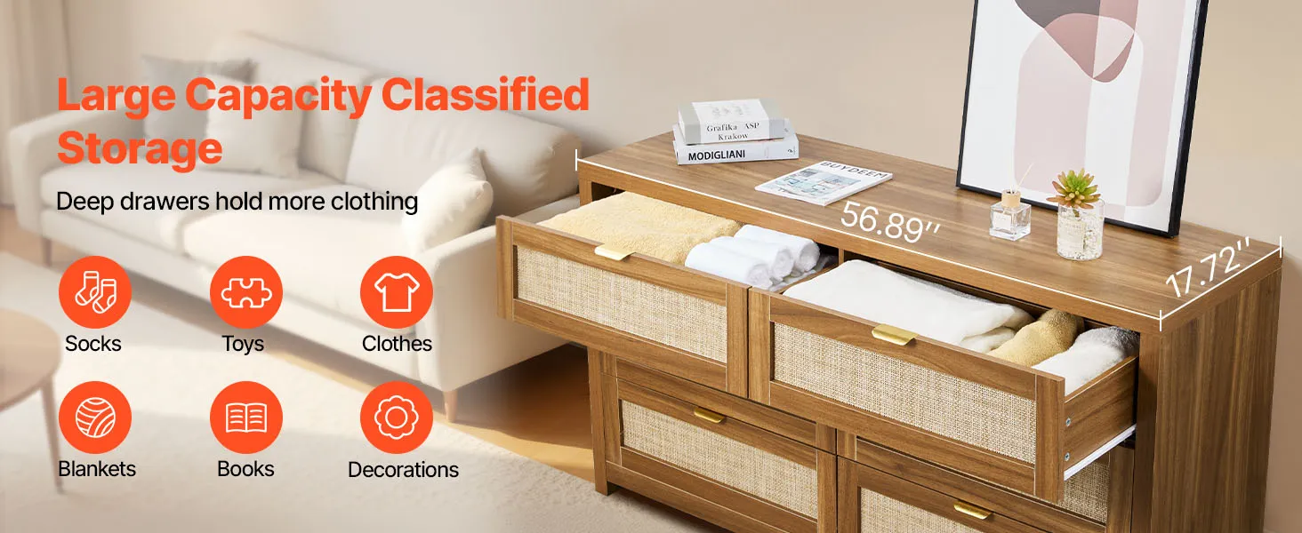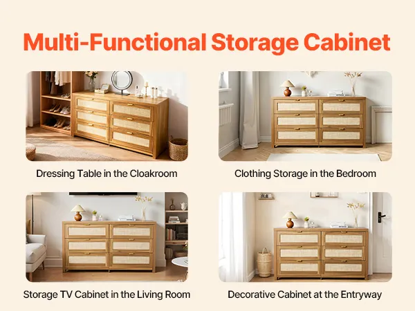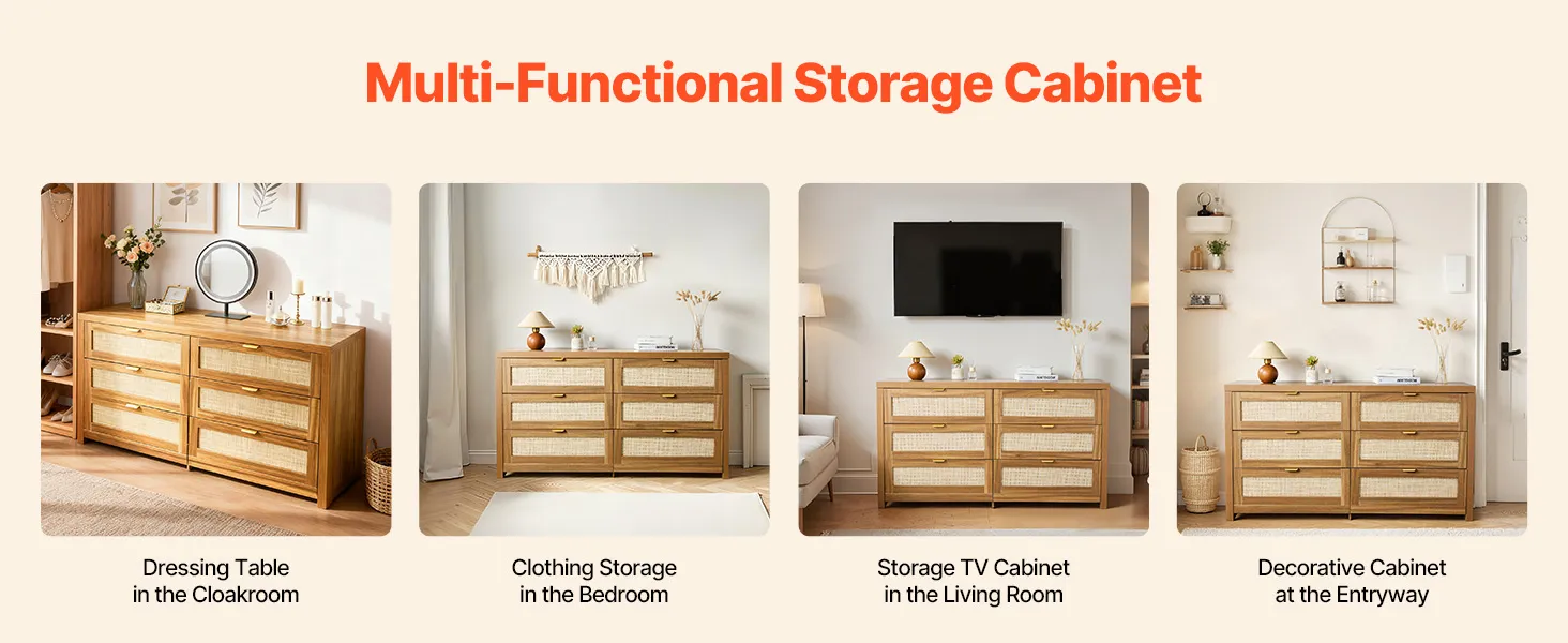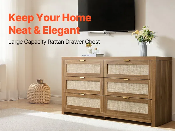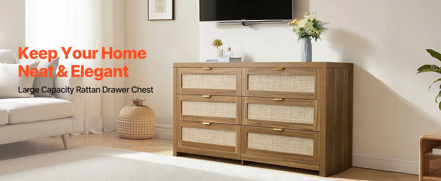 VEVOR Credenza con Armadio Rattan Intrecciato da 144,5 x 45 x 79,5 cm, Carico di 91 kg con 6 Cassetti e Maniglie in Metallo, Mobiletto Moderno in Rattan per Camera da Letto, Marrone Nocciola