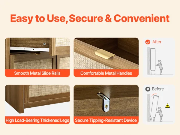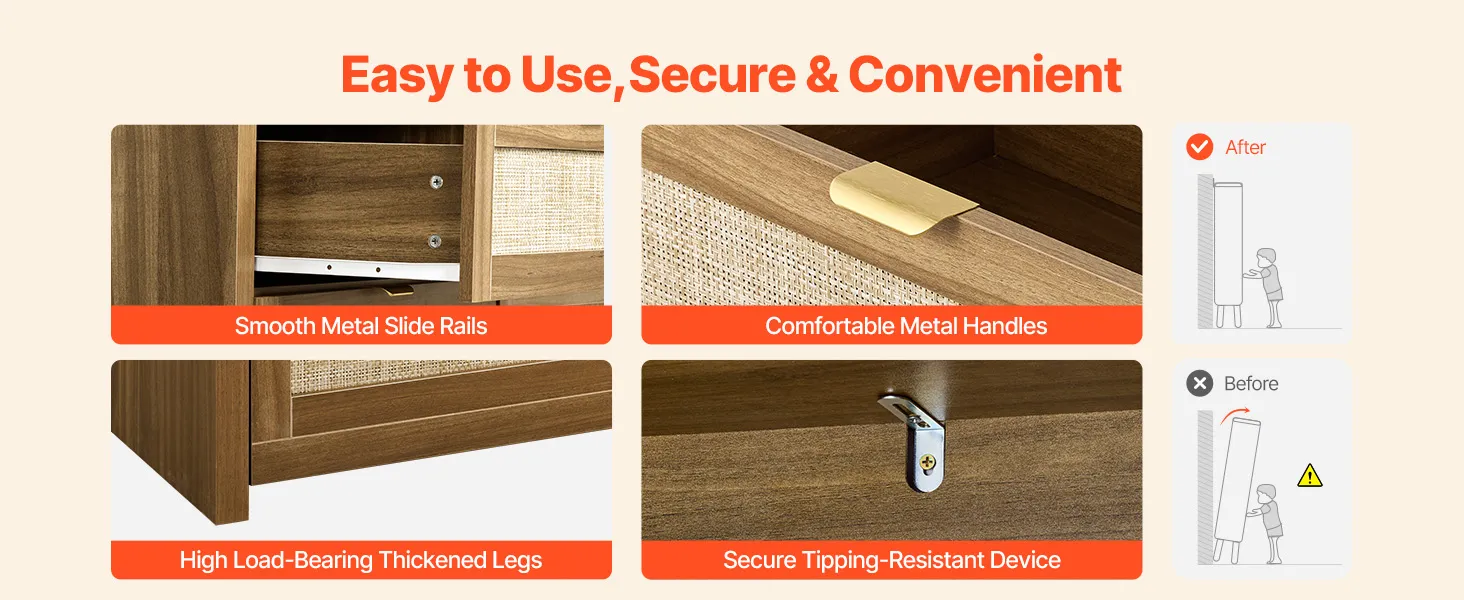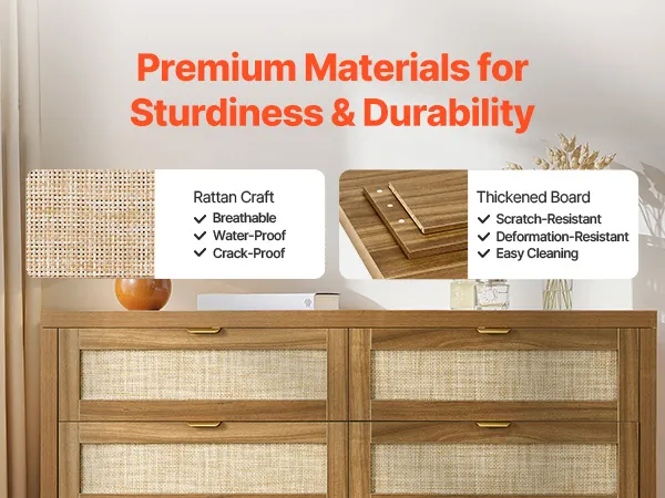 Lavorazione artigianale unica in rattan: il rattan intrecciato a mano si abbina alle maniglie in metallo, emanando un fascino vintage. Grazie al rattan, la nostra cassettiera in rattan mantiene gli oggetti al suo interno asciutti