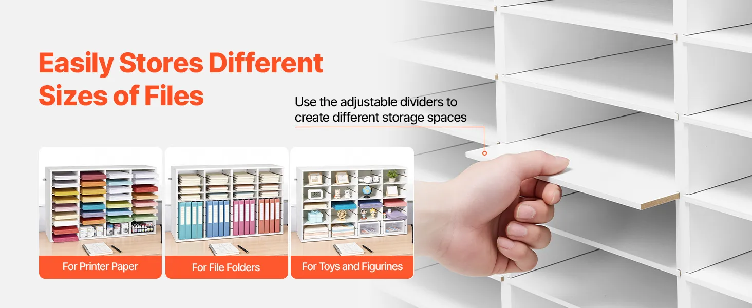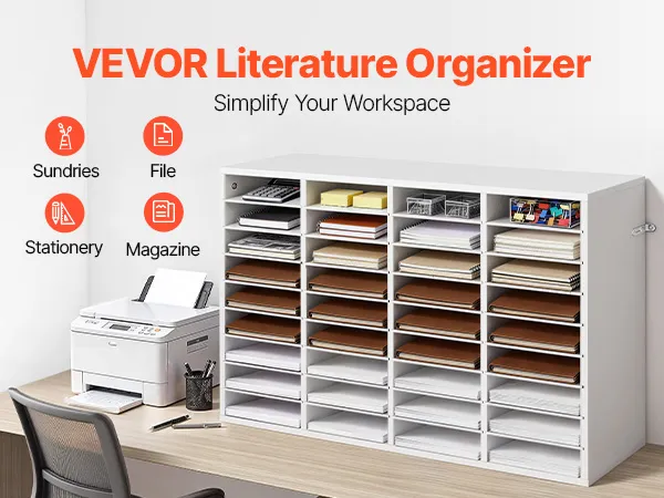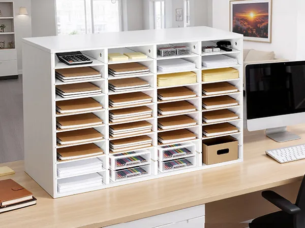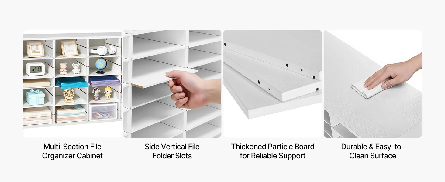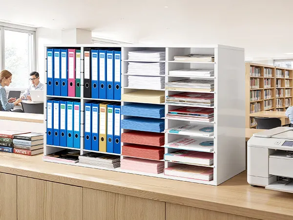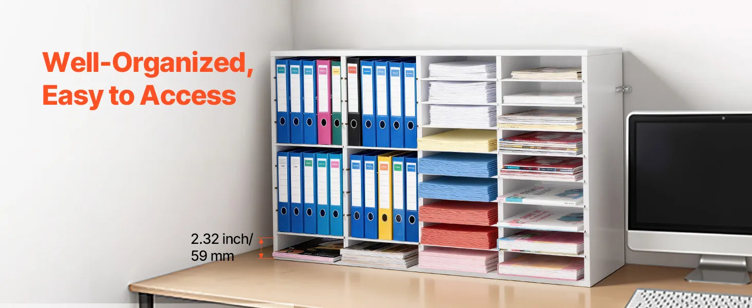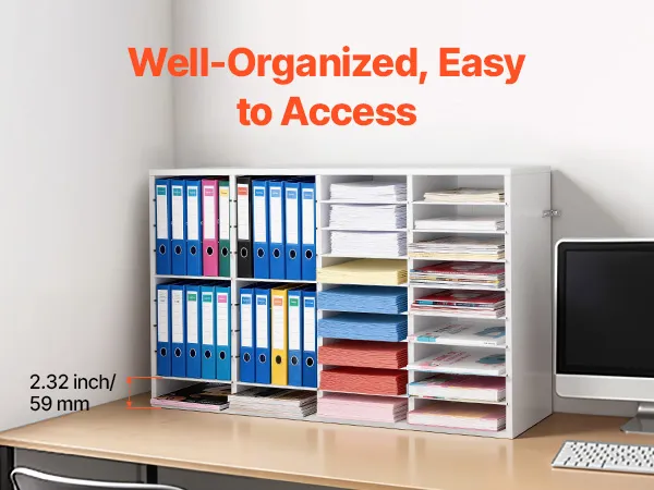 Design flessibile per l'archiviazione: Il vassoio portadocumenti mantiene fascicoli, documenti e moduli organizzati e facilmente accessibili. Ogni scomparto offre ampio spazio, mentre i ripiani rimovibili possono essere regolati per creare scomparti più alti per raccoglitori più grandi