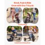 Design pensato per i genitori: L'altezza del maniglione di questo triciclo convertibile per bambini è facilmente regolabile; inoltre, il manubrio e la ruota posteriore sono pieghevoli, facilitando così lo stoccaggio e il trasporto