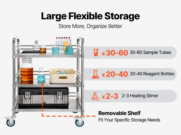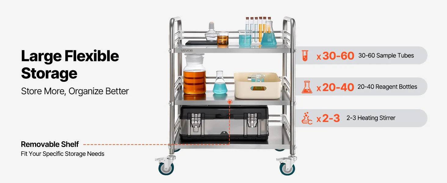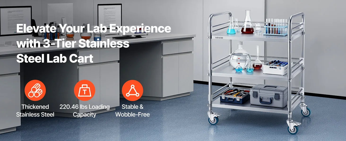 Maggiore stabilità: progettato per un'affidabilità a lungo termine, il nostro carrello da laboratorio è dotato di giunti rinforzati con connettori in acciaio ad alta resistenza per una maggiore stabilità. Puoi caricarlo in tutta sicurezza