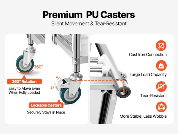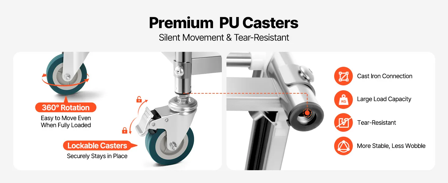 Ruote silenziose a 360°: 4 ruote girevoli in PU di alta qualità consentono un movimento facile e silenzioso. 2 ruote bloccabili garantiscono stabilità quando parcheggiato, fornendo un posizionamento sicuro anche sotto carichi pesanti