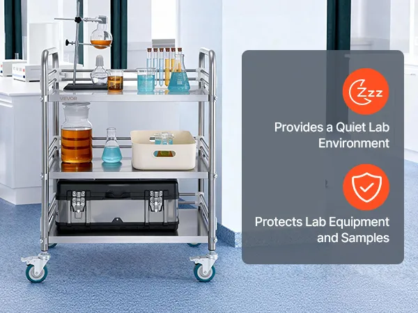 Il cotone fonoassorbente sotto i vassoi riduce le vibrazioni e il rumore durante il caricamento o lo spostamento del carrello da laboratorio, contribuendo a proteggere gli oggetti delicati e a rendere più silenzioso l'ambiente di lavoro.