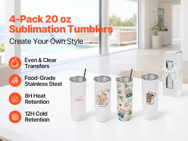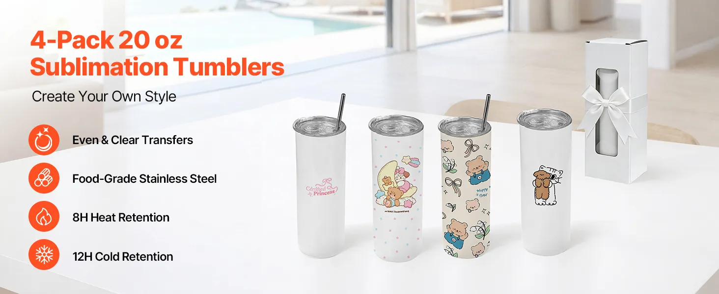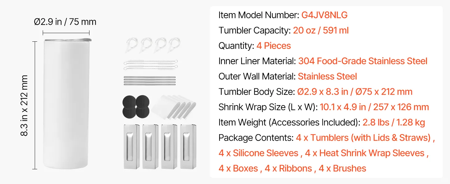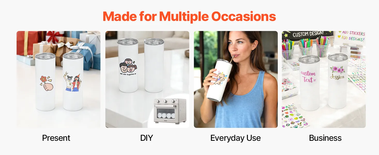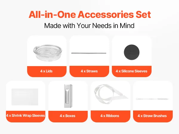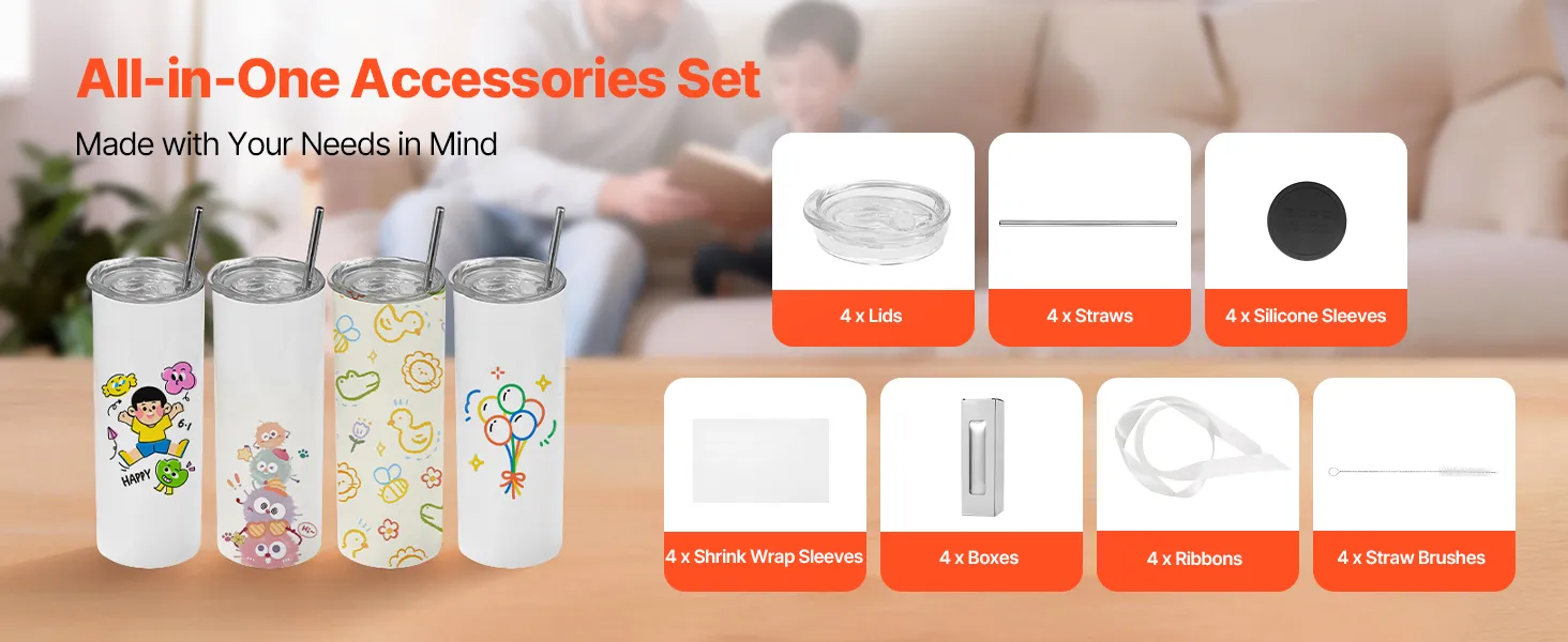 Accessori completi inclusi: Coperchi, cannucce, guaina in silicone, pellicola termoretraibile, spazzole per la pulizia, nastri e scatole. Le nostre tazze per sublimazione vuote sono pronte all'uso appena tolte dalla scatola, perfette per progetti di sublimazione semplici