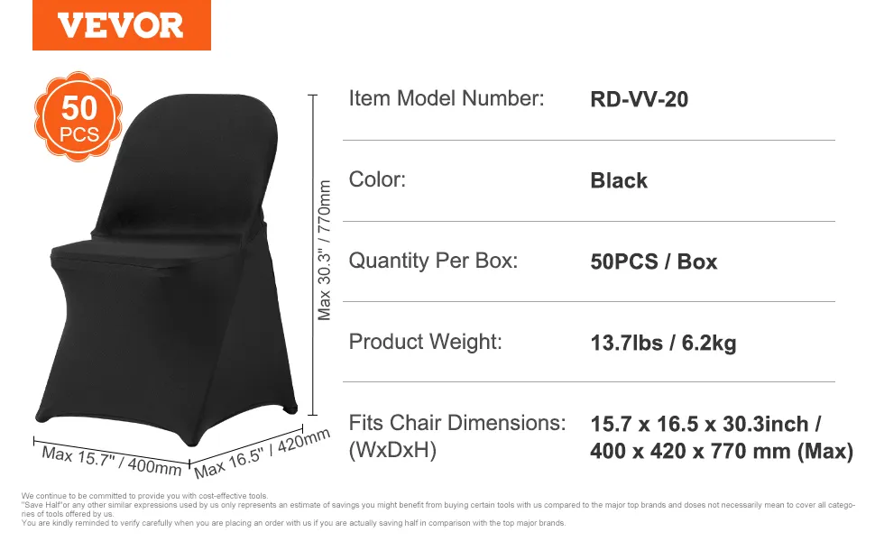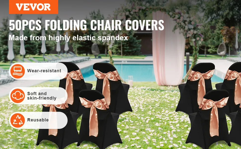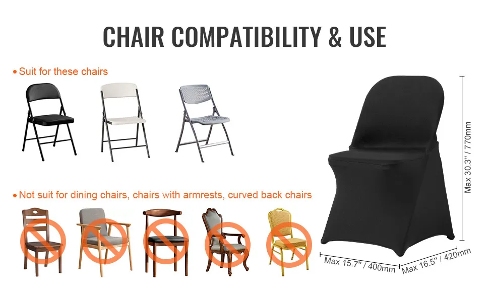 Le fodere per sedie pieghevoli in spandex elasticizzato VEVOR sono universali. Si adattano alla maggior parte delle dimensioni e forme di sedie. Il tessuto elastico assicura una vestibilità aderente e senza pieghe. Ciò le rende perfette per ogni occasione. Non importa se stai organizzando eventi formali o imminenti eventi, queste fodere si adatteranno perfettamente alle tue sedie. Il design copre completamente la sedia, garantendo un aspetto pulito e uniforme. Inoltre, le fodere sono abbastanza spesse da nascondere il colore delle sedie sottostanti. Quindi, questo assicura un aspetto uniforme durante l'evento. La vestibilità universale le rende versatili per diverse occasioni.