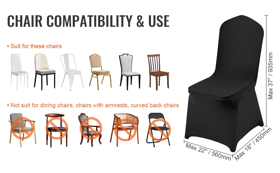 La fodera universale per sedia offre una versatilità eccezionale, progettata per adattarsi a un'ampia gamma di tipi di sedia. Con la capacità di ospitare sedie che misurano fino a 22x18x37 pollici, queste fodere offrono una vestibilità sicura e su misura su diversi stili di sedia, tra cui opzioni in metallo, plastica e imbottite. Il tessuto elasticizzato in spandex si adatta perfettamente, assicurando che non ci siano spazi vuoti o scivolamenti. Questa caratteristica le rende ideali per eventi in vari contesti, dalle sale per banchetti e hotel ai luoghi all'aperto. Gli organizzatori di eventi troveranno queste fodere una soluzione affidabile e che fa risparmiare tempo, poiché nessuna sedia rimane scoperta, indipendentemente dalla sua forma o dimensione.