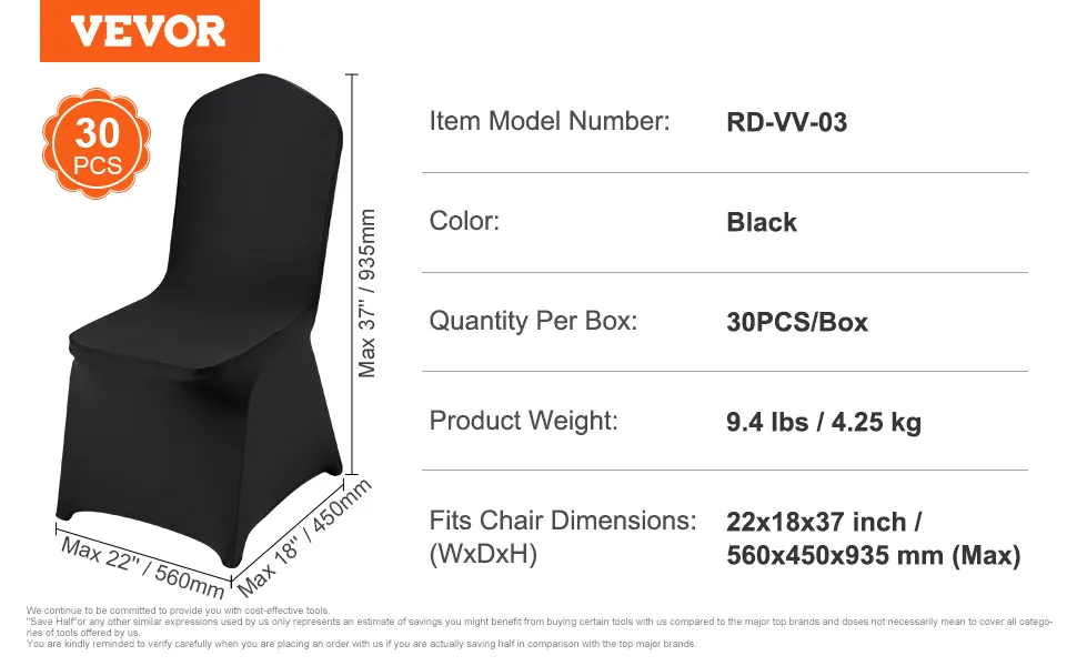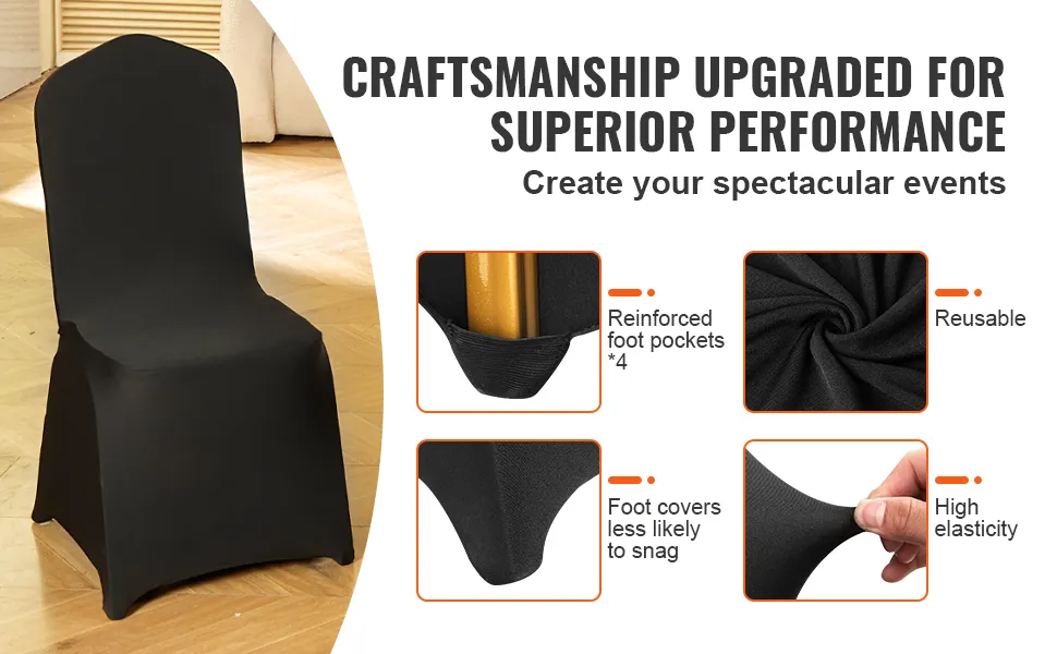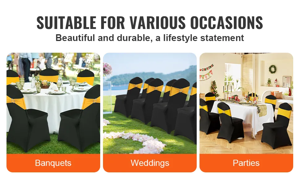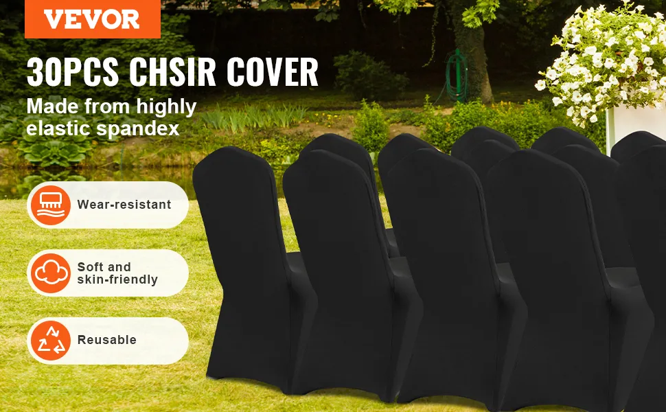 Le fodere per sedie pieghevoli in spandex elasticizzato VEVOR sono disponibili nel classico colore nero, offrendo un look sofisticato e senza tempo. Il nero è sinonimo di qualità, eleganza e versatilità, il che lo rende un colore ideale per vari temi e ambientazioni di eventi. Che tu stia organizzando un gala formale o una celebrazione intima, le fodere per sedie nere completano qualsiasi arredamento senza sopraffare il design generale. Oltre al loro aspetto elegante, il tessuto nero è pratico, poiché nasconde sporco e macchie, il che lo rende una scelta intelligente per eventi ad alto traffico. Queste fodere offrono sia funzionalità che bellezza, assicurando che il tuo evento sembri curato dall'inizio alla fine.