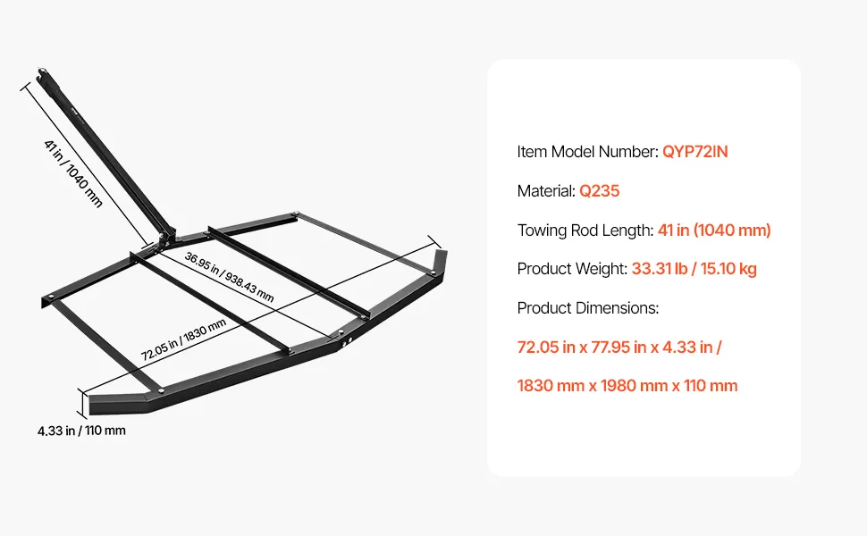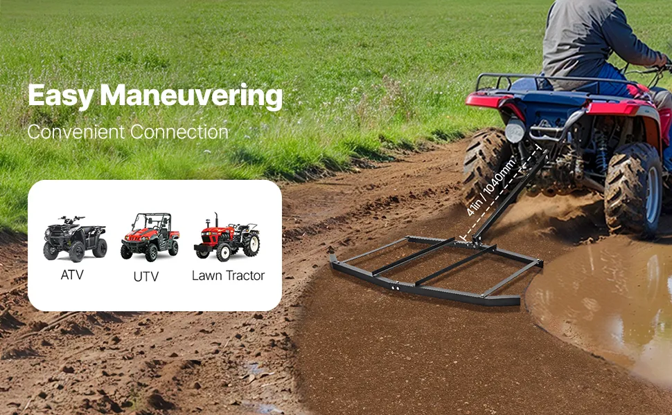 Facile da usare: con una barra di trazione da 41 pollici e una larghezza di attacco da 1,77 pollici, questo erpice trainato è compatibile con vari veicoli, consentendo un rapido collegamento alla maggior parte di ATV, UTV, trattorini da giardino e trattori multifunzionali, garantendo un funzionamento efficiente e conveniente