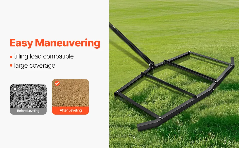 Straordinario effetto livellante: con il suo peso di 33,31 libbre, questo rastrello erpice a trascinamento penetra facilmente nel terreno, rompendo i grumi e levigando il terreno duro per un livellamento efficiente. La sua larghezza consente la copertura di ampie aree, completando le attività in modo rapido ed efficiente