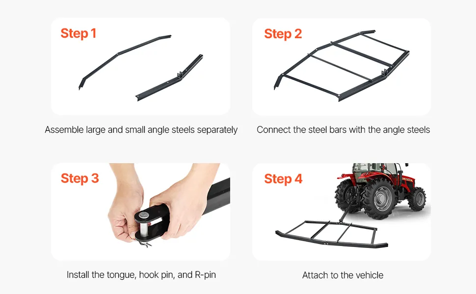 Montaggio rapido: dotato di un semplice montaggio con dadi e rondelle autobloccanti, il rastrello a erpice a trascinamento assicura un'installazione rapida e stabile. Questo design impedisce l'allentamento durante l'uso, garantendo un funzionamento fluido e sicuro