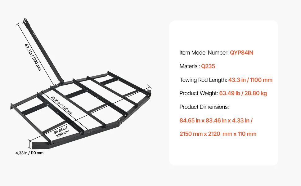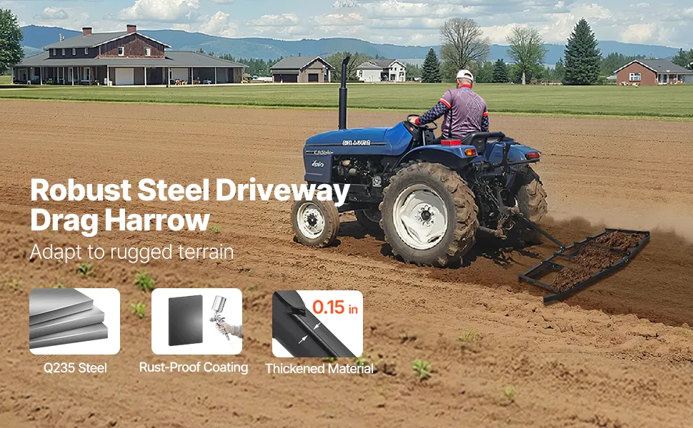 Questo erpice a trascinamento è realizzato in acciaio Q235 resistente con una barra di trazione da 43,3 pollici, ideale per terreni complessi. Con una capacità di peso aggiuntiva di 50 libbre, livella profondamente il terreno pur essendo facile da montare.