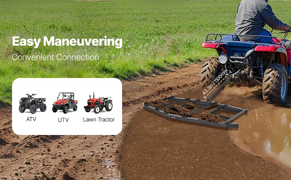 Facile da usare: con una barra di trazione da 43,3 pollici e una larghezza di attacco da 1,77 pollici, questo erpice trainato è compatibile con vari veicoli, consentendo un rapido collegamento alla maggior parte di ATV, UTV, trattorini da giardino e trattori multifunzionali, garantendo un funzionamento efficiente e conveniente