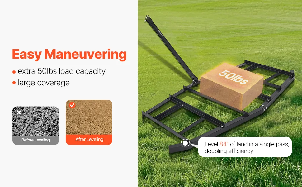 Straordinario effetto livellante: con un intervallo regolabile da 0 a 33 pollici e la capacità di trasportare fino a 50 libbre di mattoni refrattari, più il suo peso di 63,49 libbre, questo rastrello erpice a trascinamento penetra facilmente nel terreno, rompendo i grumi e levigando il terreno duro per un livellamento efficiente