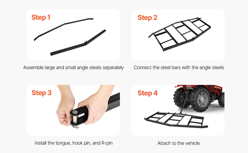 Montaggio rapido: dotato di un semplice montaggio con dadi e rondelle autobloccanti, il rastrello a erpice a trascinamento assicura un'installazione rapida e stabile. Questo design impedisce l'allentamento durante l'uso, garantendo un funzionamento fluido e sicuro