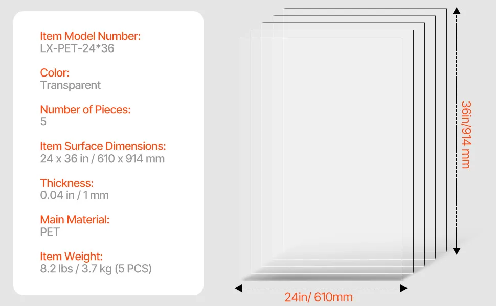 Ogni foglio misura 24 x 36 pollici/610 x 914 mm, 0,04 pollici (1 mm) di spessore, realizzato in materiale PET di alta qualità per un'eccellente trasparenza e durata. Facilmente tagliato, forato o piegato a caldo utilizzando strumenti come seghe o trapani.