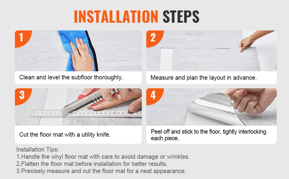 Installazione fai da te: basta staccare e attaccare su un pavimento piatto o su una superficie della parete per l'installazione. La carta di supporto è dotata di contrassegni per un facile taglio in diverse dimensioni. L'installazione fai-da-te non richiede utensili elettrici, rendendo l'installazione semplice.