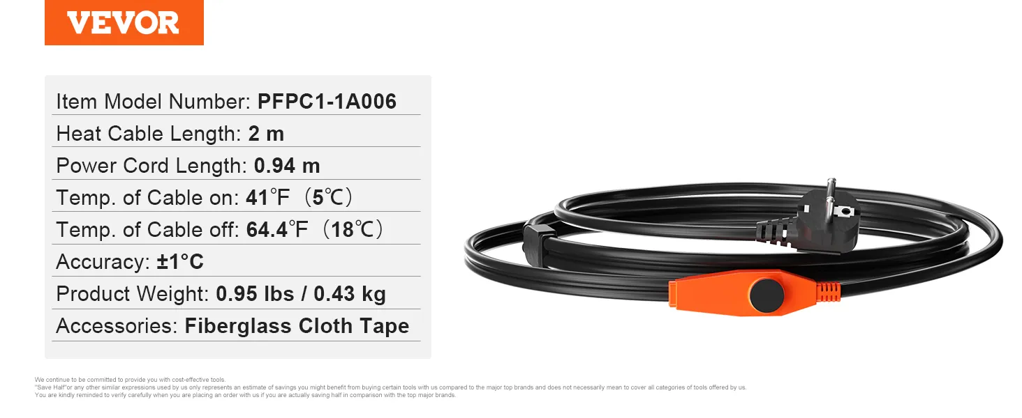 VEVOR Cavo Riscaldante per Tubi Lunghezza da 2m 23 W/m per Tubi con Termostato Integrato, Cavo Riscaldante per Tubi dell'Acqua Protezione Tubi in PVC, Tubi in Metallo e Plastica dal Congelamento