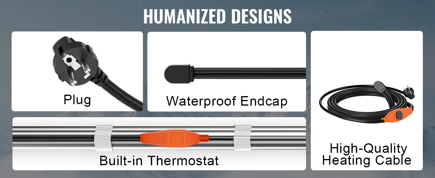 Termostato integrato di alta qualità: con il termostato integrato con una precisione di ±1°, il nastro riscaldante per tubi dell'acqua si accende automaticamente a 5℃ e smette di funzionare a 18℃. Rispetto a un termostato a manicotto termorestringente, il nostro termostato per stampaggio a iniezione ad alta resistenza è più sicuro da usare.