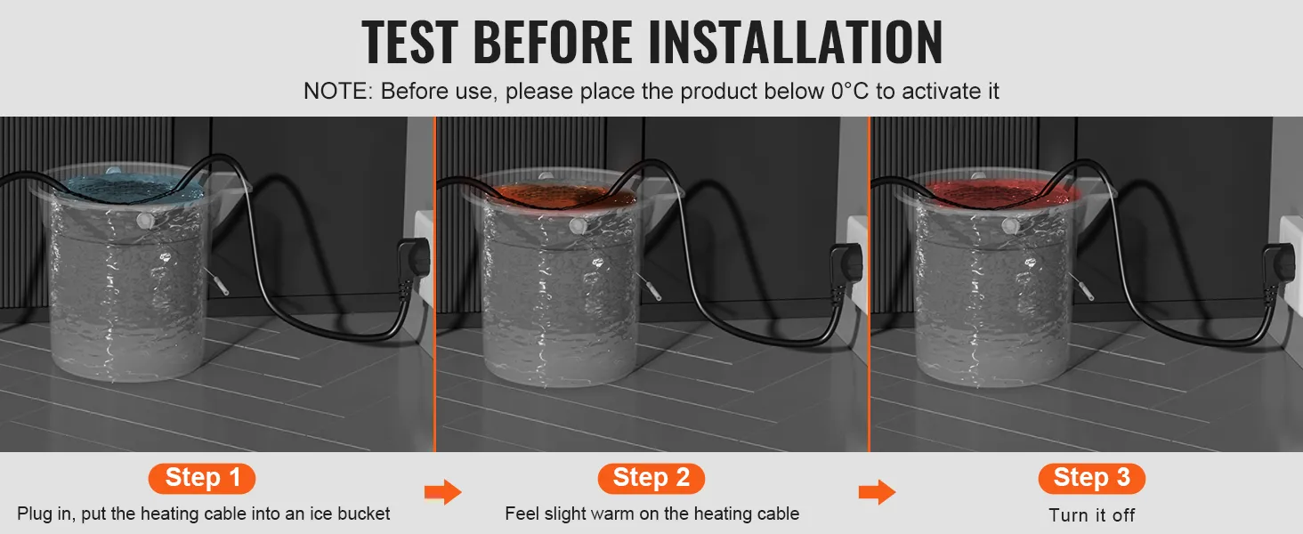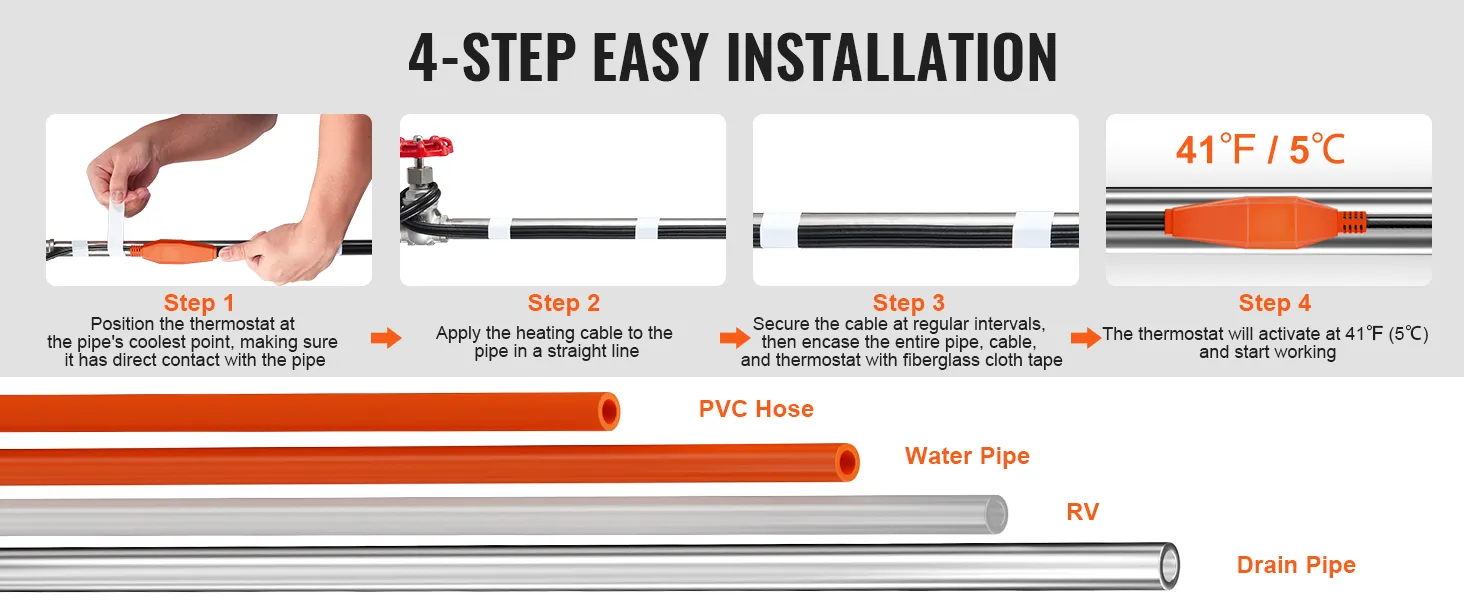 Installazione comoda: il cavo riscaldante preassemblato è progettato per una facile installazione. Disporlo in linea retta, non incrociare o sovrapporre il cavo. Assicurarsi che il termostato e l'intero cavo riscaldante siano a pieno contatto con il tubo per prestazioni ottimali. Si prega di testare il cavo prima dell'installazione.
