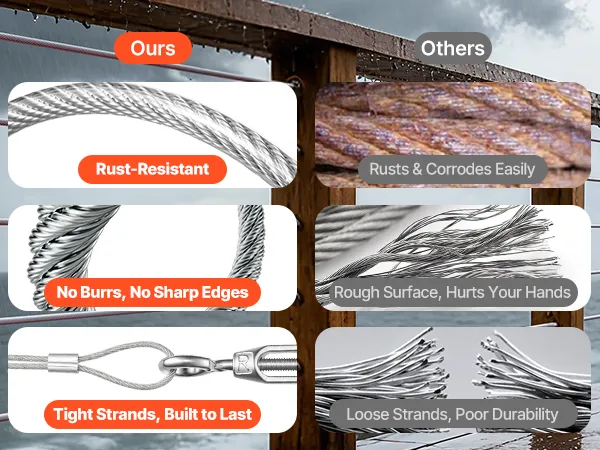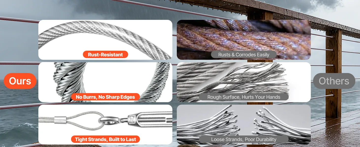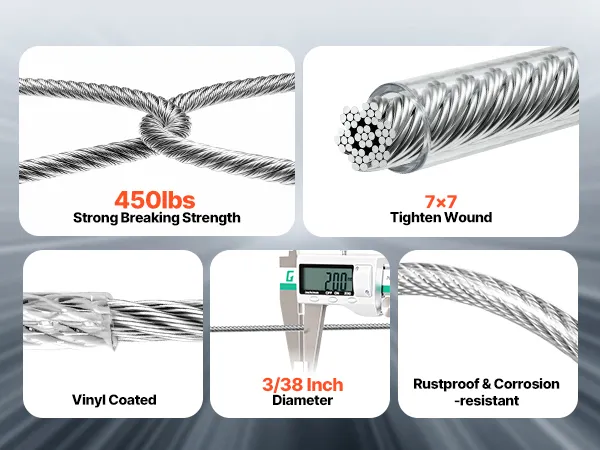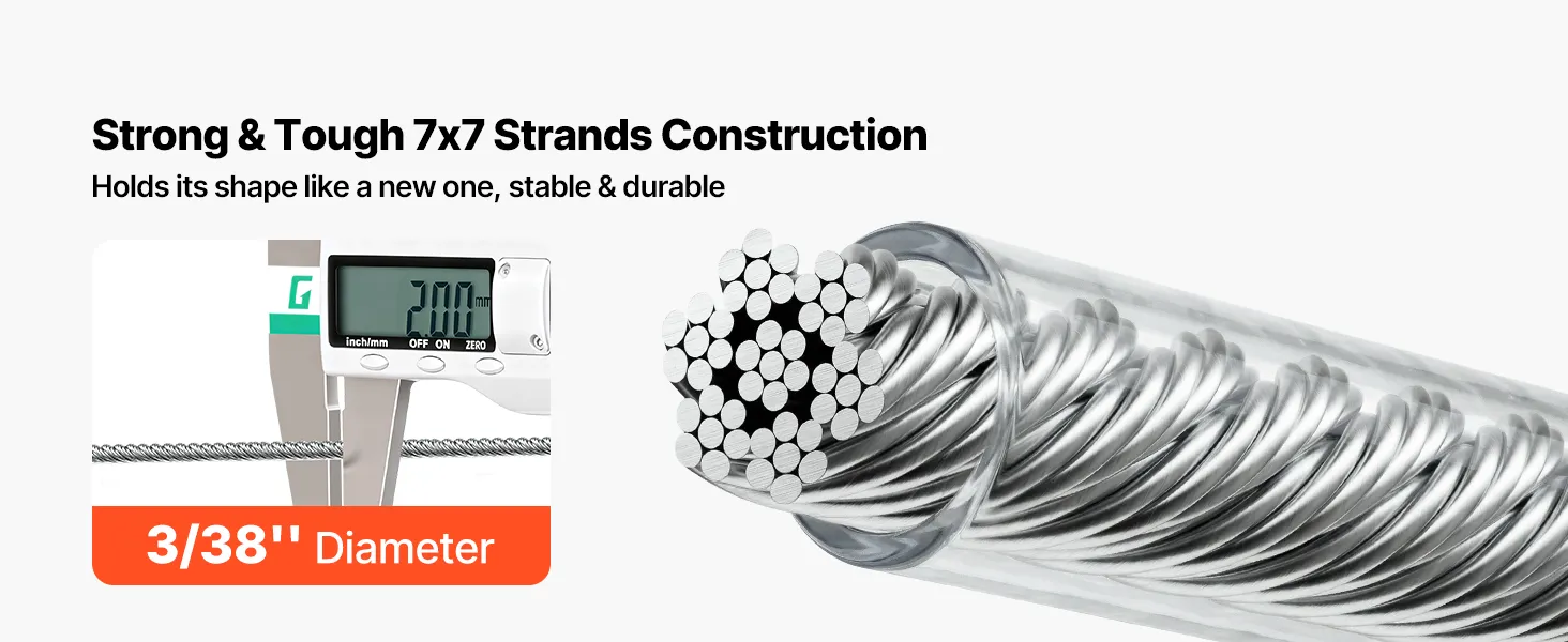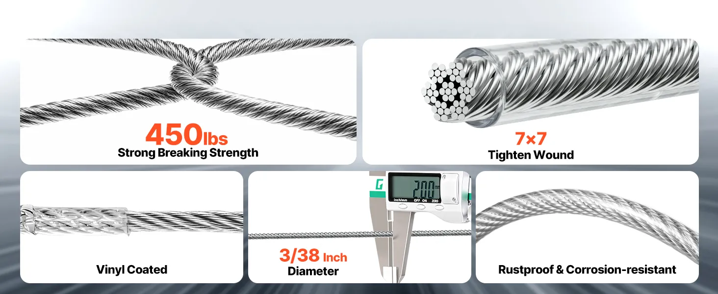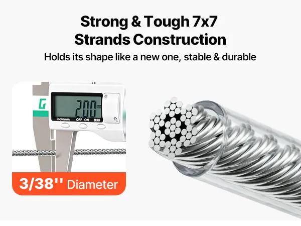 Alta qualità 304 Inossidabile: questo cavo in acciaio è realizzato in acciaio inossidabile 304 con rivestimento in PVC impermeabile per la massima resistenza alla ruggine. Si ottiene una cordatura 7x7 stretta e una sensazione liscia