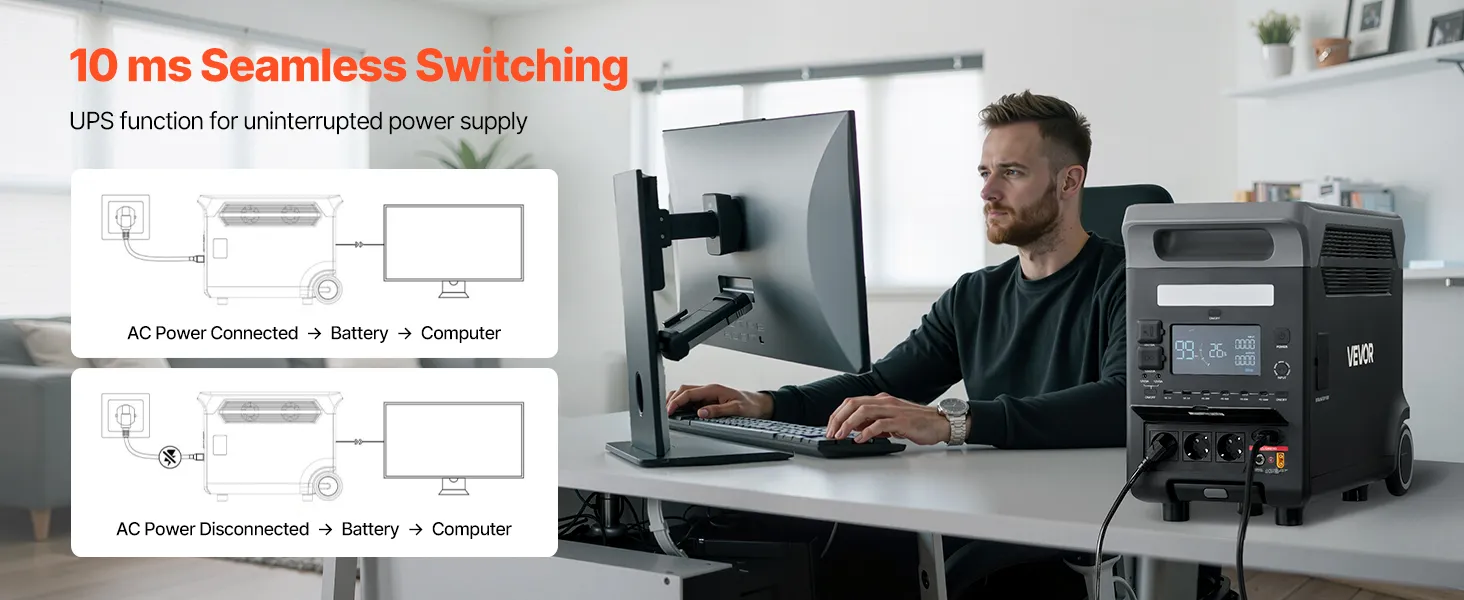 Grazie alla funzione UPS integrata, il generatore solare della centrale elettrica passa automaticamente all'alimentazione a batteria entro 10 ms durante le interruzioni, mantenendo in funzione computer, router e altri dispositivi critici senza perdite di dati o interruzioni.
