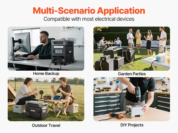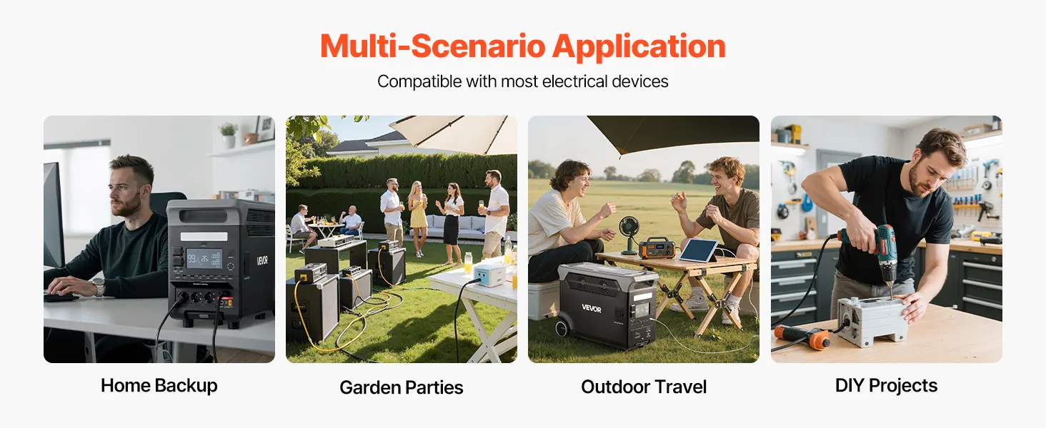 Grande potenza per un uso prolungato: la centrale elettrica portatile VEVOR da 3600 W è dotata di una batteria LiFePO₄ ad alta capacità da 3840 Wh. Ideale per il backup domestico o per le avventure all'aperto, alimenta rapidamente smartphone, lampade