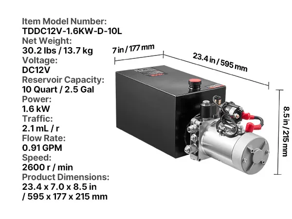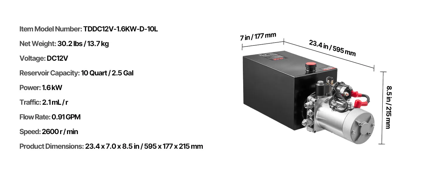 Potenza che puoi sentire: questa unità di potenza idraulica da 12 V CC e 1,6 kW sposta 0,91 GPM con un serbatoio da 10 quarti, una pressione di esercizio di 16-20 MPa e fino a 3.200 psi