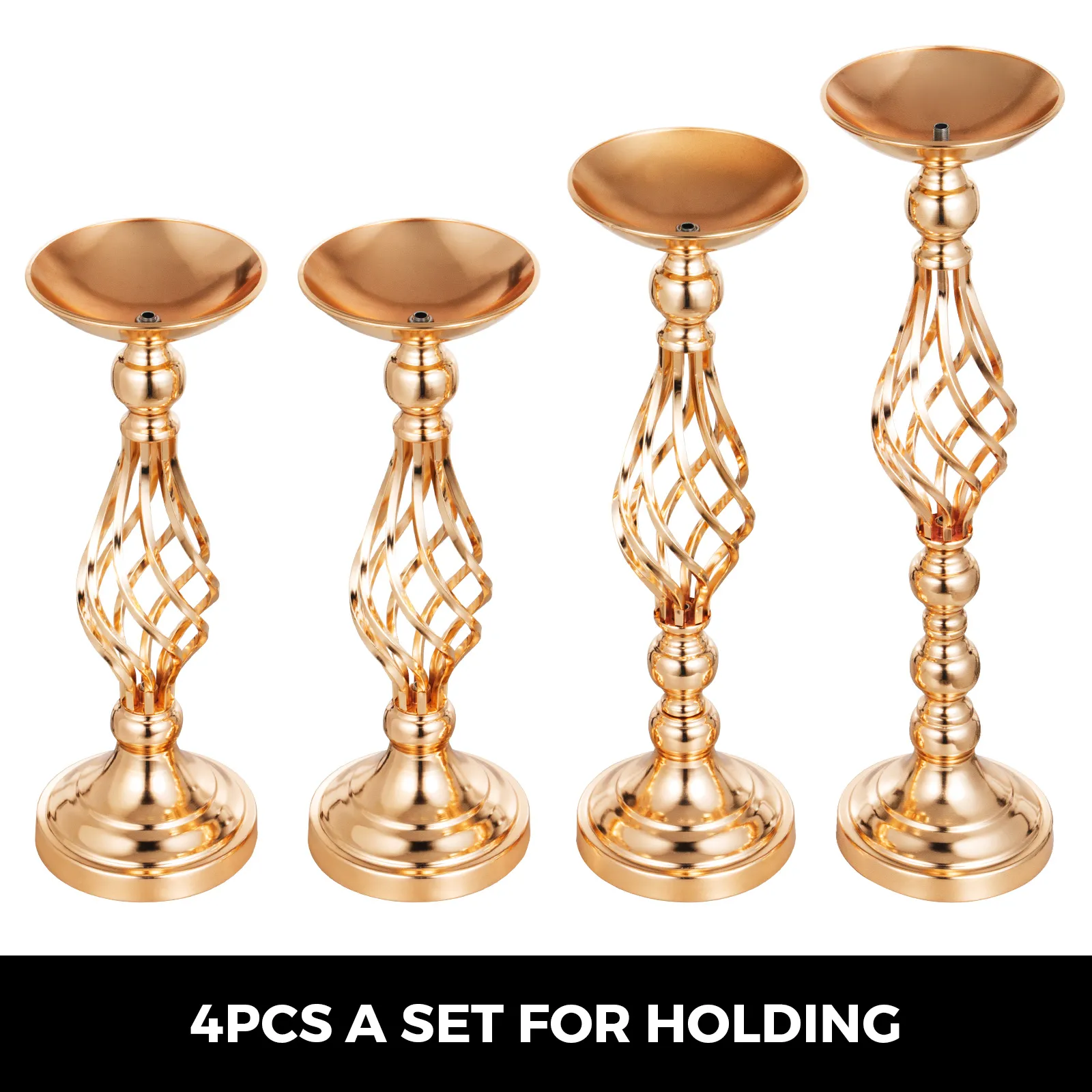 • 【QUALITÀ PREMIUM】 - Quantità: 4 pezzi; Colore: oro; Altezza: 40cm / 47cm / 53cm. Questo kit di fioriere è costruito con ferro robusto ed elettroplaccato per antiruggine. Tempo di servizio lungo e stabile sul tavolo. Invia anche un fiore artificiale come decorazione.