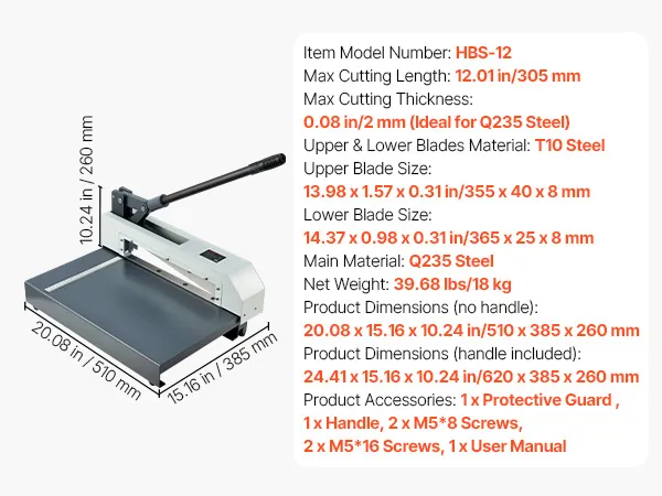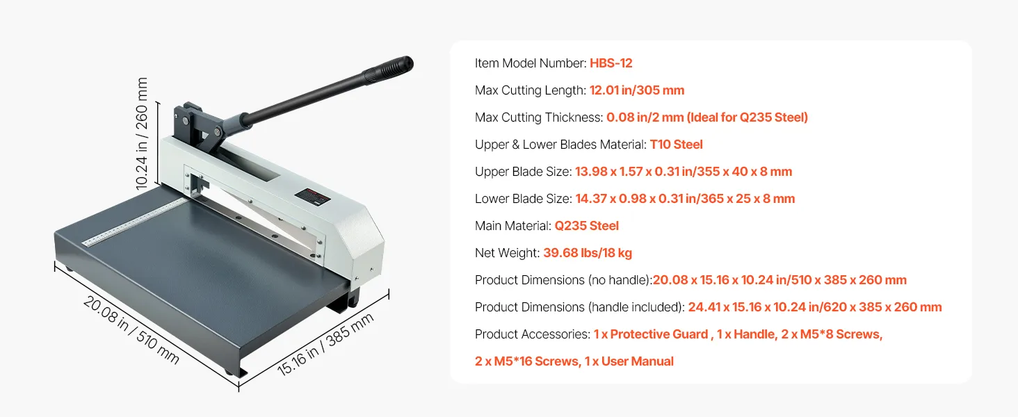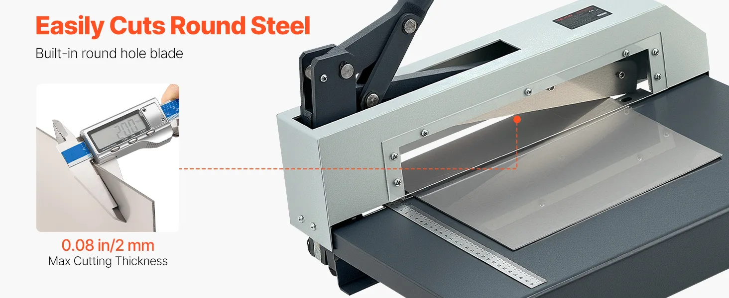 Questa cesoia a ghigliottina è ideale per tagliare alluminio, acciaio inossidabile e acciaio a basso tenore di carbonio. È dotata di lame in acciaio T10 e di una lama circolare, con una lunghezza di taglio massima di 30,5 cm, uno spessore di 2,5 cm.