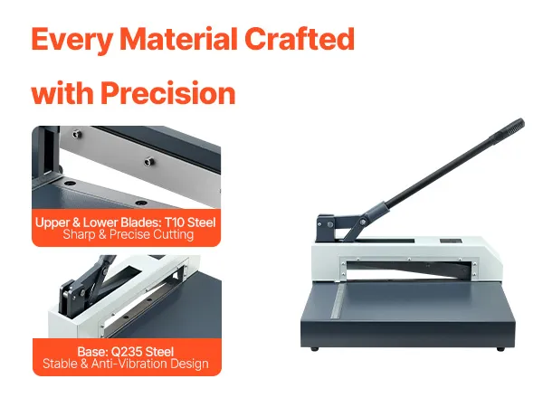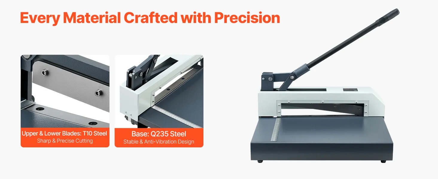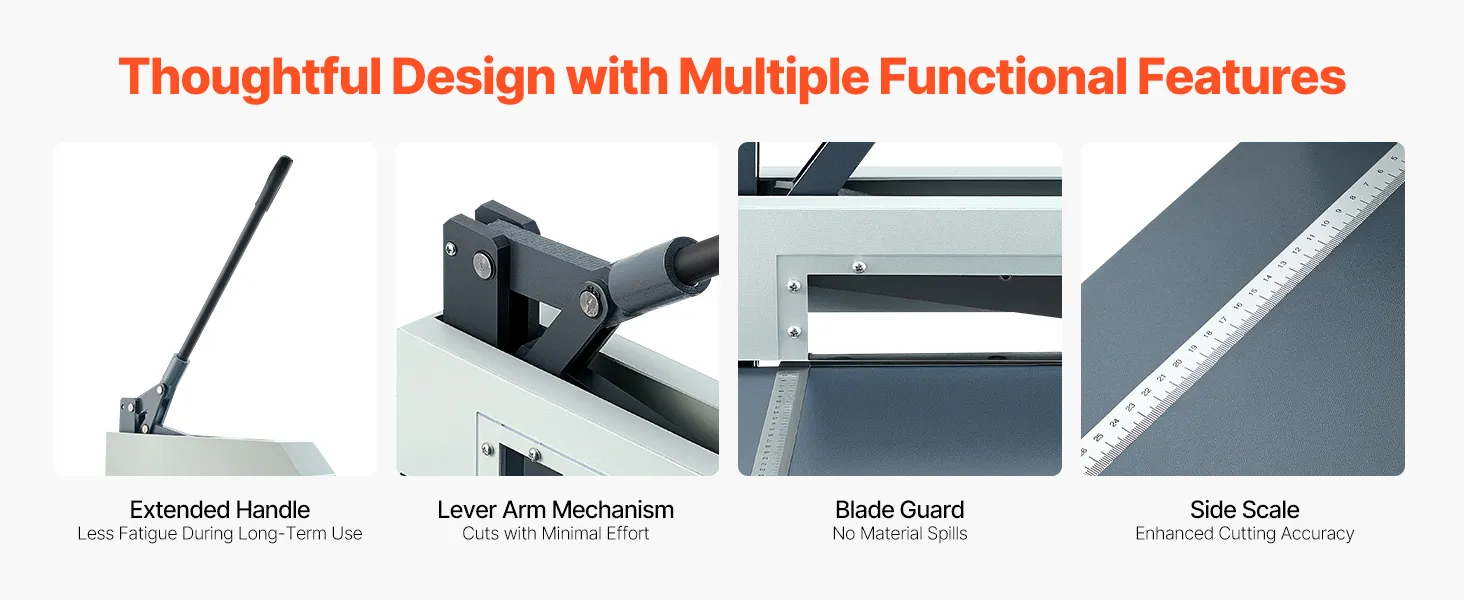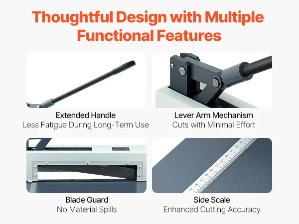 La nostra taglierina a ghigliottina è dotata di un'impugnatura allungata, progettata per ridurre l'affaticamento e favorire la leva. La lama è dotata di una protezione per evitare schizzi di materiale, mentre la scala graduata laterale migliora la precisione di taglio.